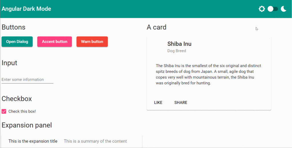 And that's it! We now have "proper" dark mode for our Angular material app, which spans all of our material components, the background and the foreground colors.