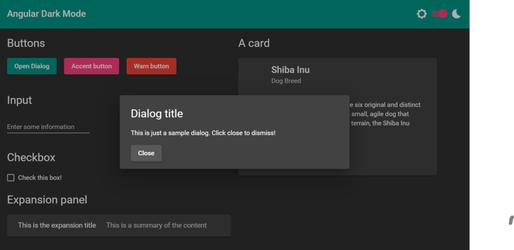 To test this, we've added a simple material dialog in our app, which opens up with the first primary button. The dialog now follows the dark mode theme just like the other components.