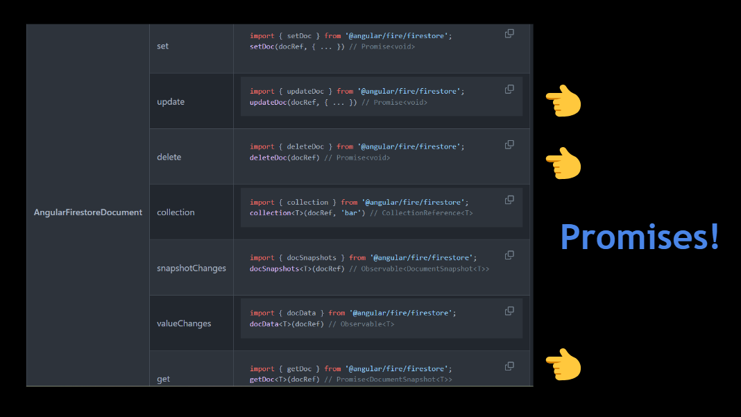 But do we really need it even here? Turns out if you’re integrating with firebase and either using the JS SDK or even angular/fire v7, you’ll notice it has a promise-based API for most of its operations - along with some convenience functions which output observables.