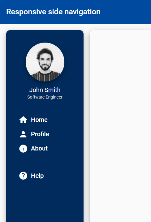 <mat-toolbar> Responsive side navigation </mat-toolbar>