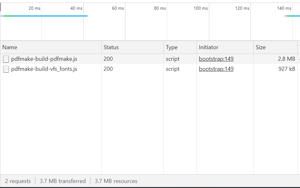 However, PDFMake is big library with a bundle size of approximately 3.7 MB. If we use the above approach, it is going to make our app bundle size unnecessarily large, even if only a part of our app needs the PDF generation. With an increasing focus on web performance nowadays, this would be an unwise move!