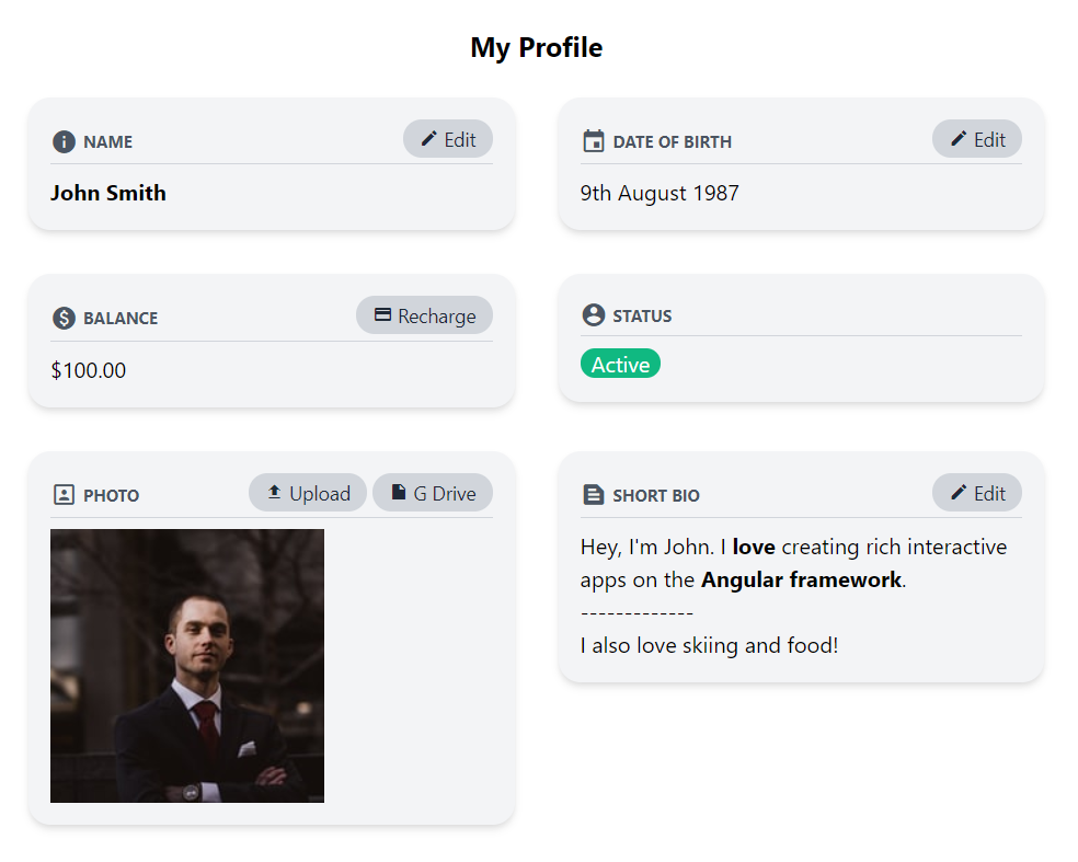 Previously we had created a profile page which had different kinds of profile data like below.