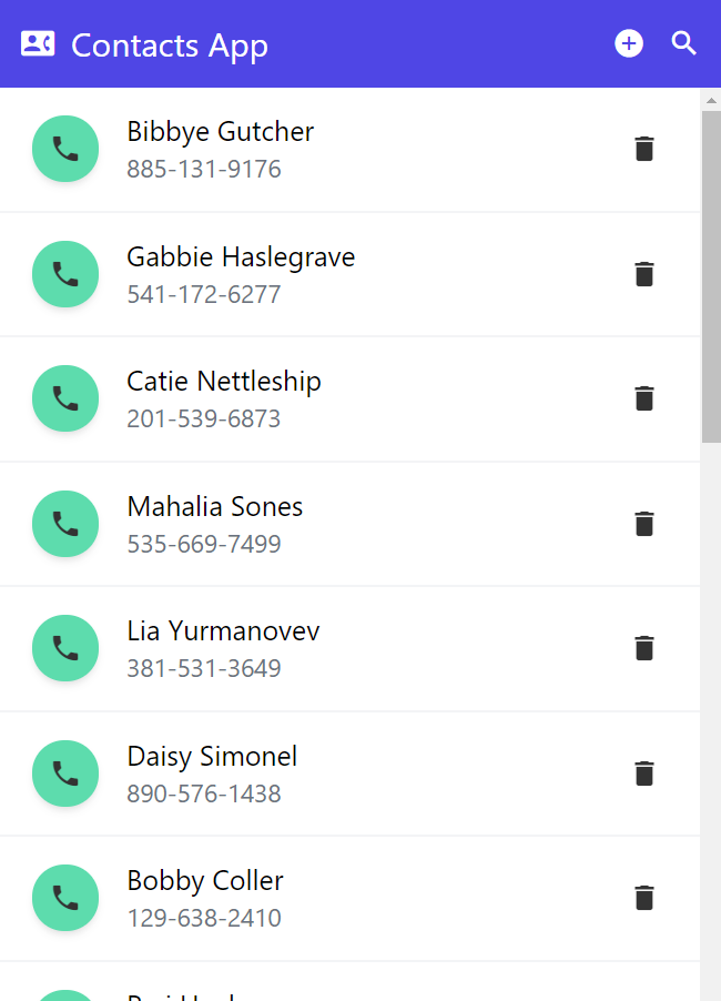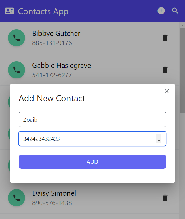 So let us see how we can add the component store to our apps. I have here a simple contacts app - where you can store your list of contacts, search for them, add a new contact and delete a contact. Oh and you can also call the contact directly using the call button. This is built without any state management.