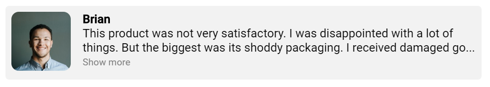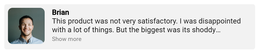 <p ellipsis [ngClass]="{ 'line-clamp': !showMore }">This product was not very satisfactory. I was disappointed with a lot of things. But the biggest was its shoddy packaging. I received damaged goods. Please beware of sellers on this site, not all of them are trusted!</p>