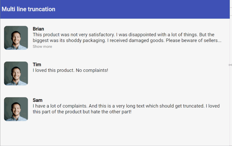 If you're a keen observer though, you'll notice this still has a problem. The "Show more" button always shows up, even if the text is short and fits in the same, with no truncation required. Unfortunately, though, there is no real solution to this.